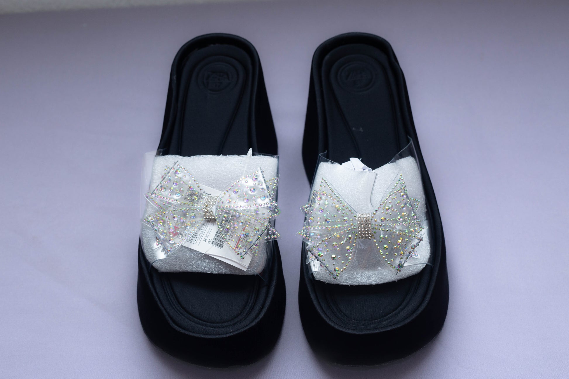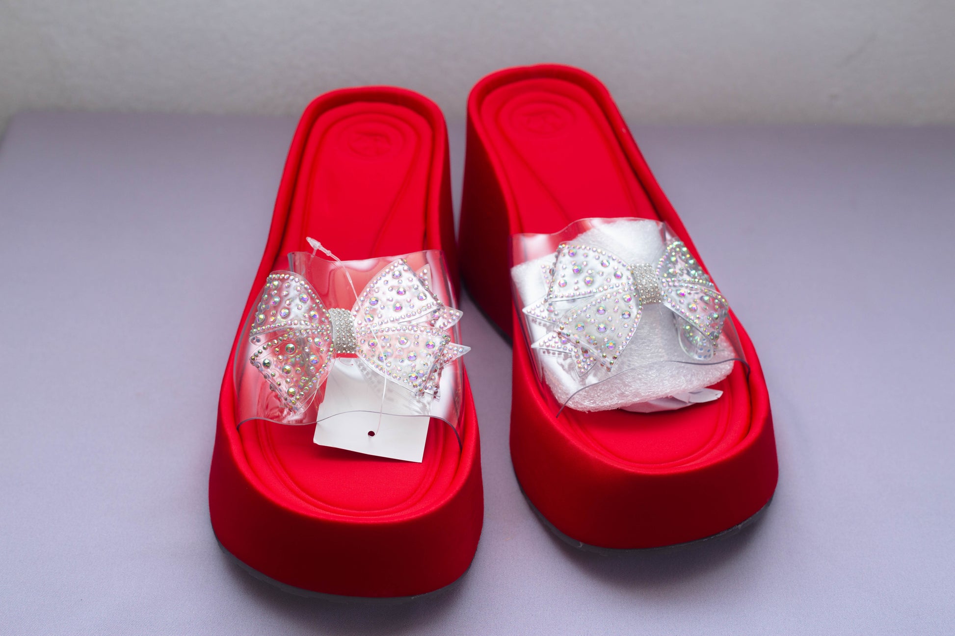Ces sandales compensées à nœud sont l'accessoire parfait pour un look audacieux et féminin. Leur design vibrant et le nœud décoratif orné de strass apportent une touche de fantaisie et de glamour à toutes vos tenues. La semelle compensée, à la fois stable et confortable, vous offre une allure élancée sans sacrifier le bien-être de vos pieds.