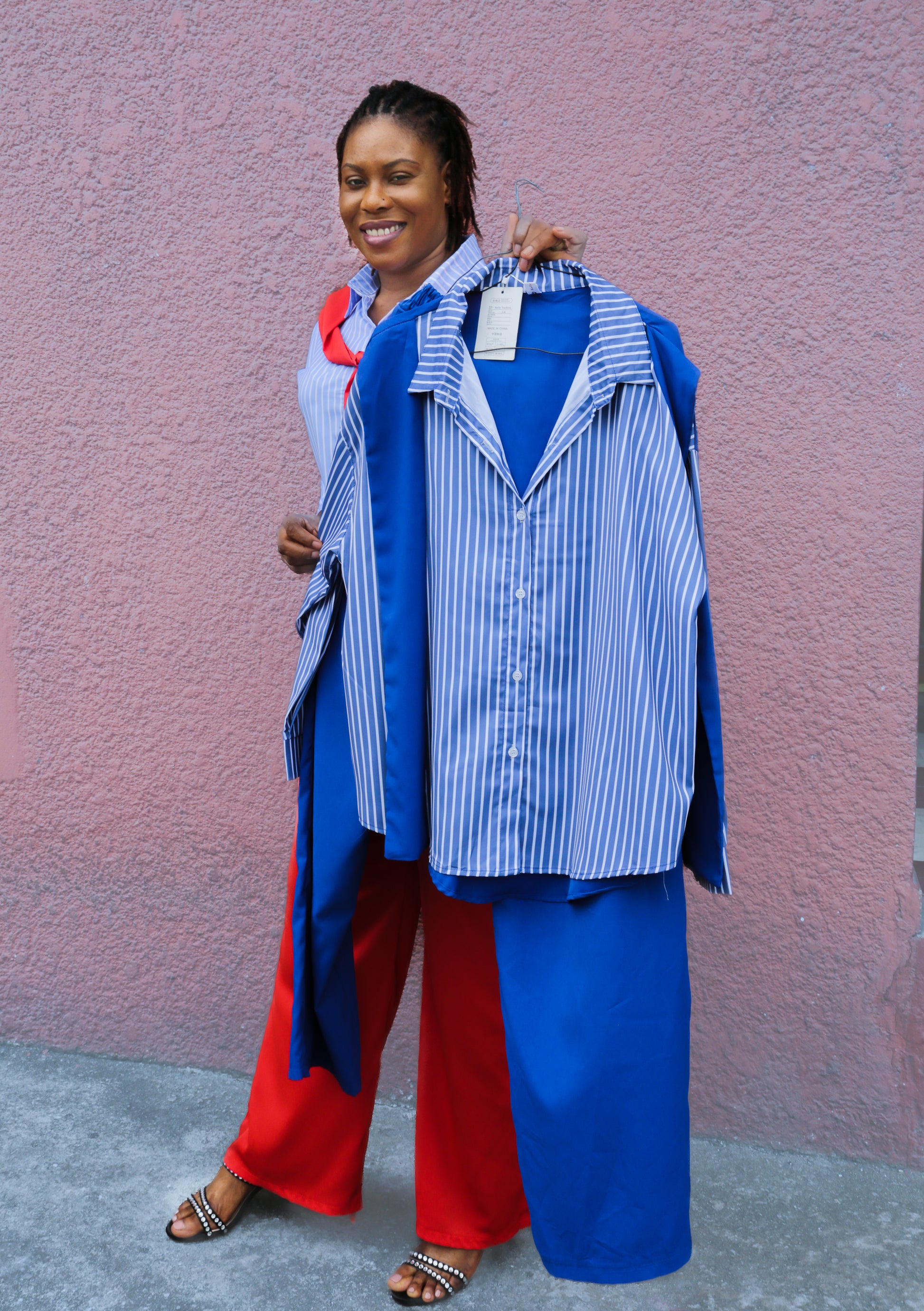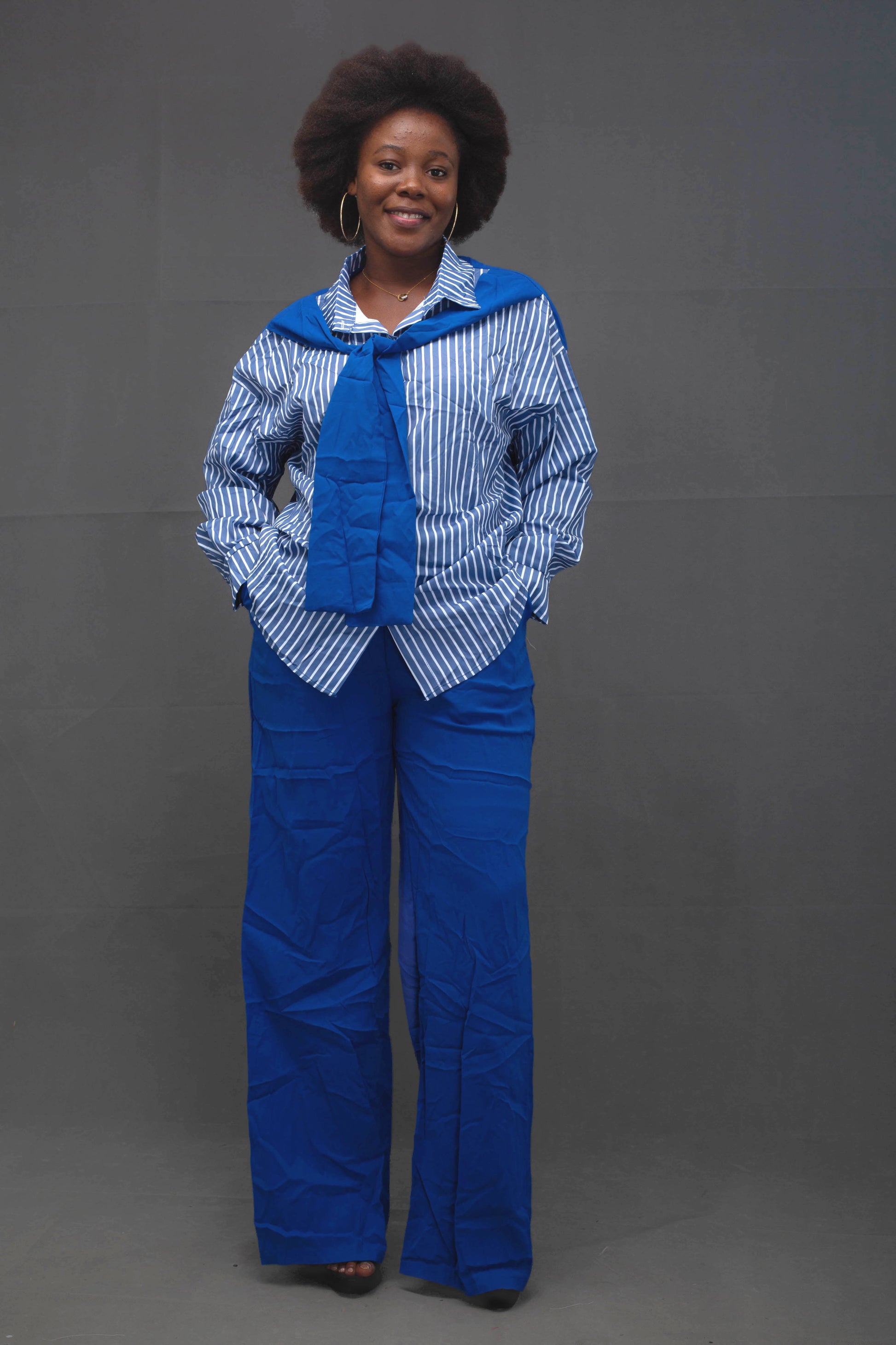 Cet ensemble deux pièces (pantalon et chemise) est parfait pour un style à la fois décontracté et structuré. La chemise rayée est un classique. Le pantalon large crée une silhouette moderne et très confortable.
