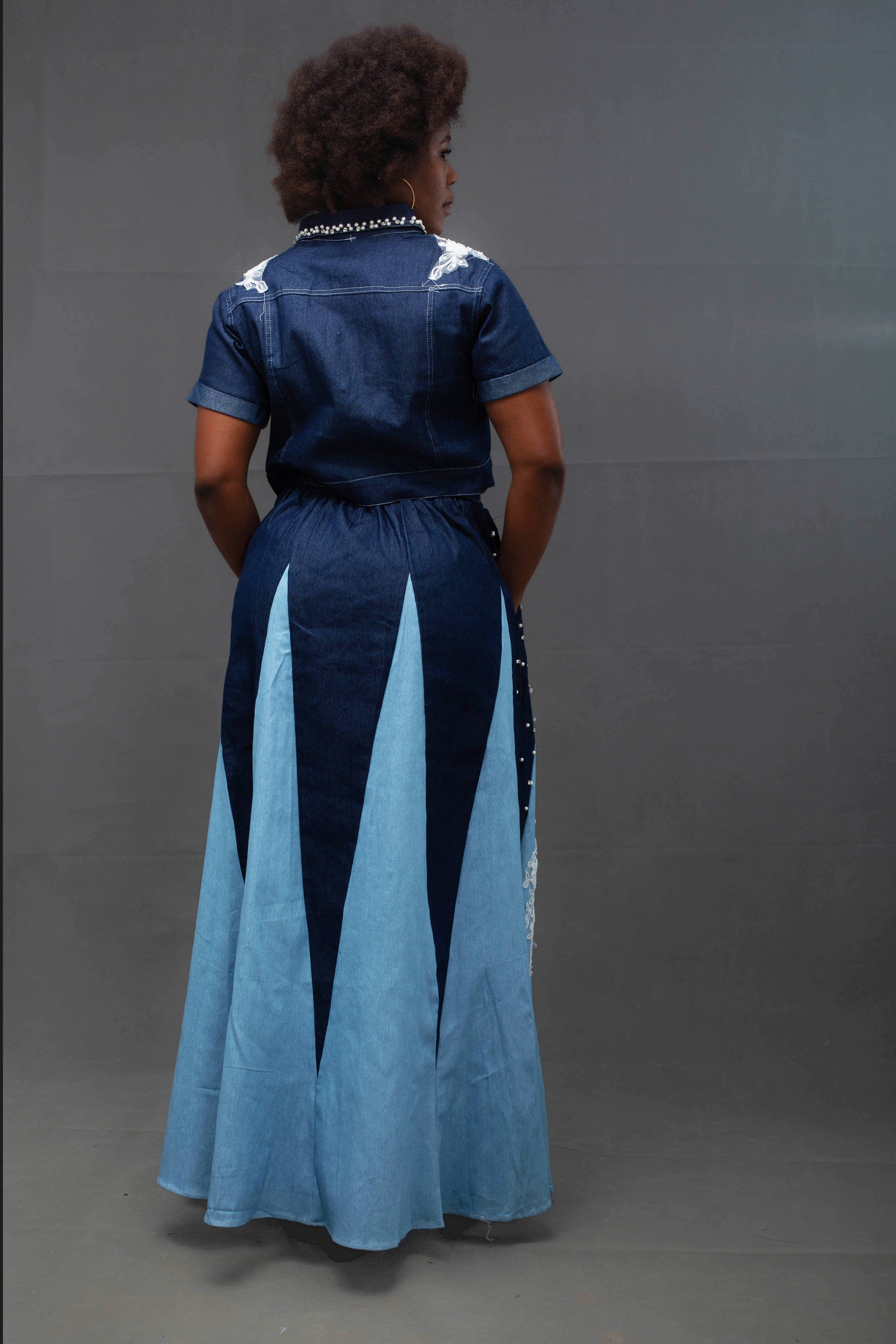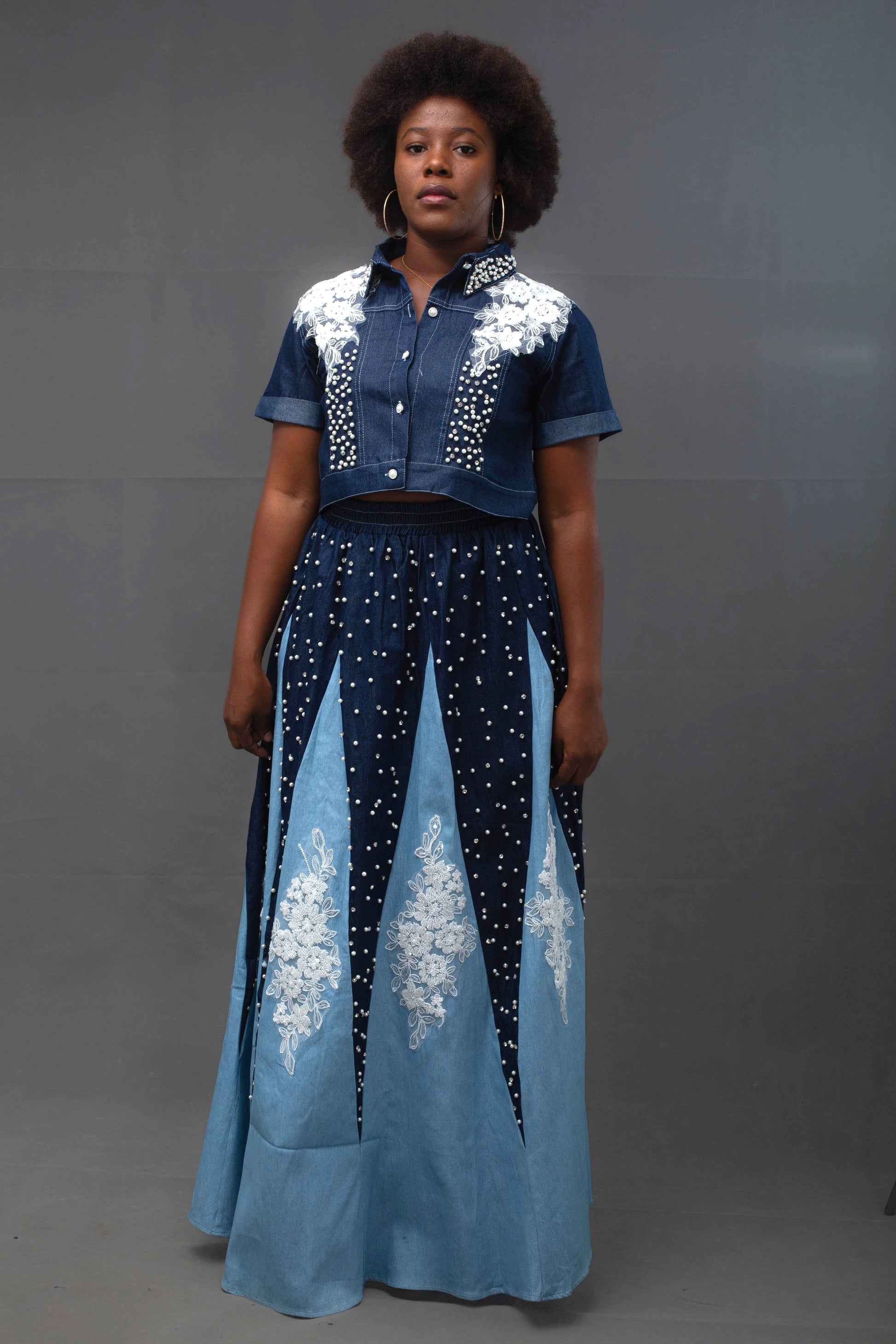 Cet ensemble deux pièces (crop top et jupe longue) est parfait pour un style à la fois décontracté et sophistiqué. Le denim est enrichi de broderies et de perles. La jupe longue fluide assure une silhouette élancée et élégante.