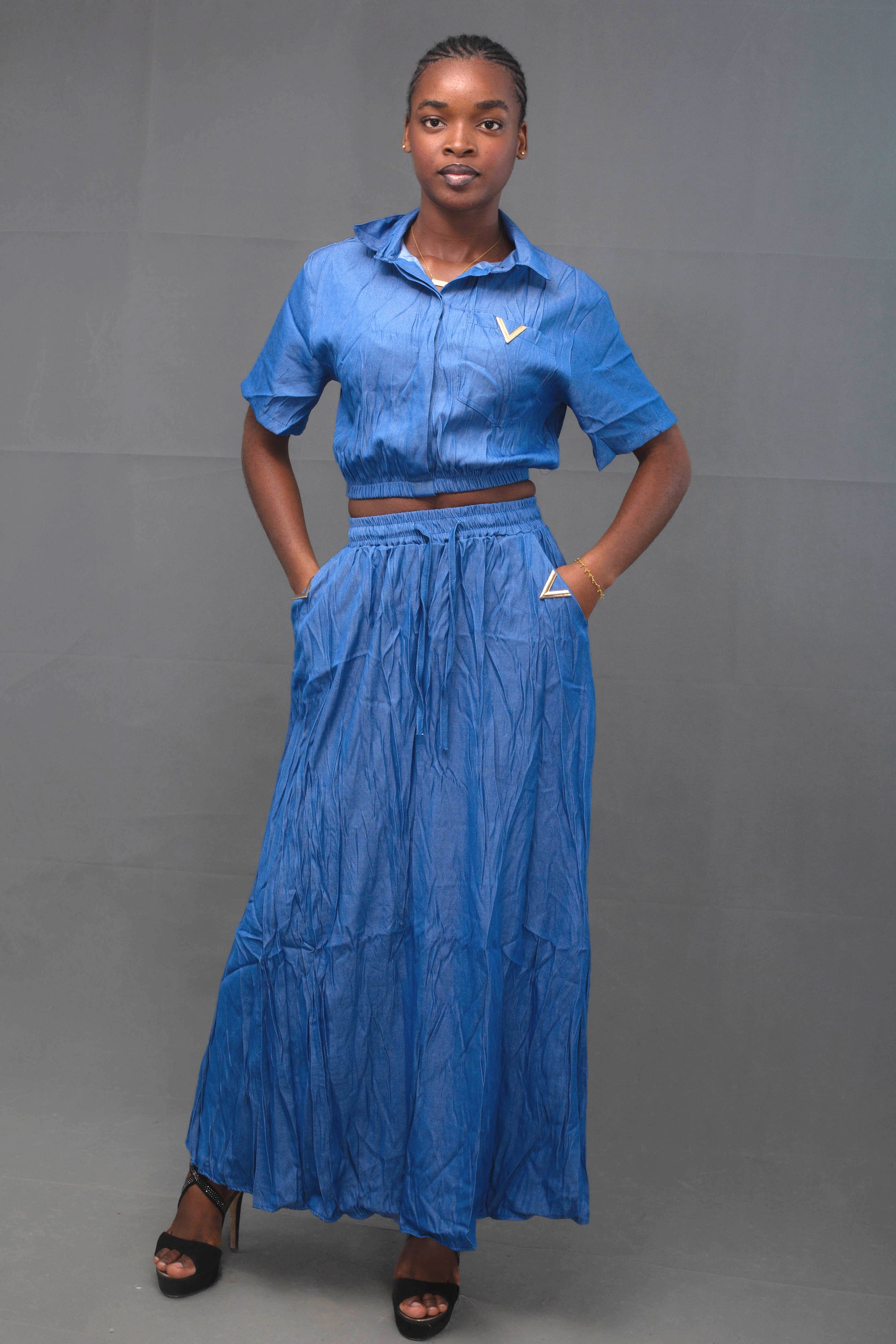 Cet ensemble deux pièces offre un look moderne et facile. Le tissu a une texture froissée unique. Le crop top court met en valeur la taille. La jupe longue fluide assure une silhouette élancée.