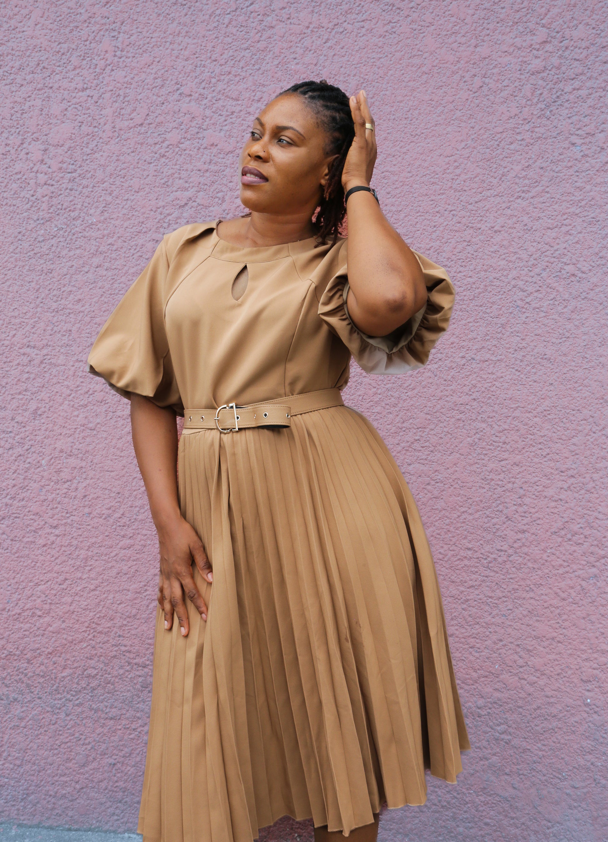 Cette robe est la pièce idéale pour un look sophistiqué et facile. Sa coupe mi-longue élégante et ses manches structurées créent une silhouette très flatteuse. La ceinture marque la taille pour un effet chic immédiat.