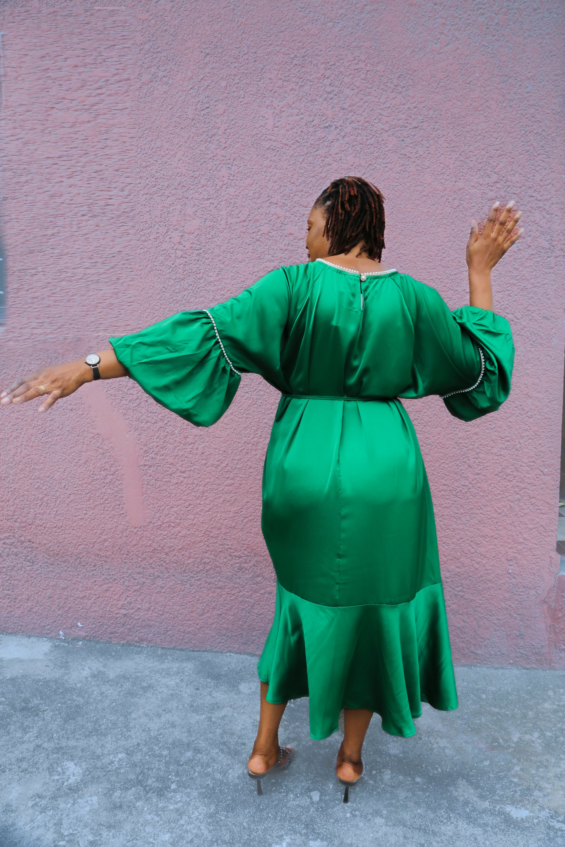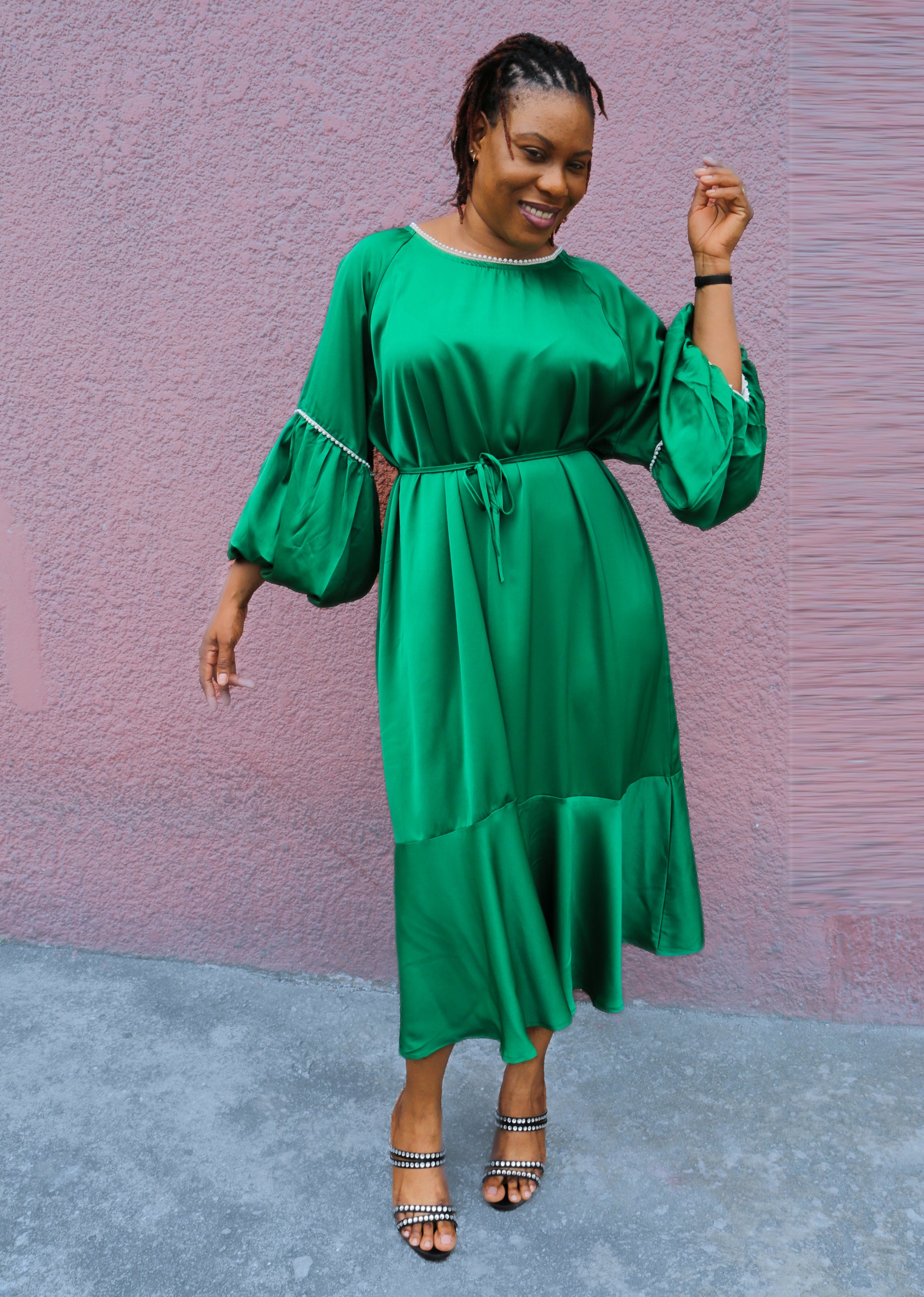 Cette robe est parfaite pour un look glamour et confortable. Le tissu satiné et ses manches bouffantes créent une silhouette riche et sophistiquée. Un cordon fin permet de marquer la taille à votre guise.