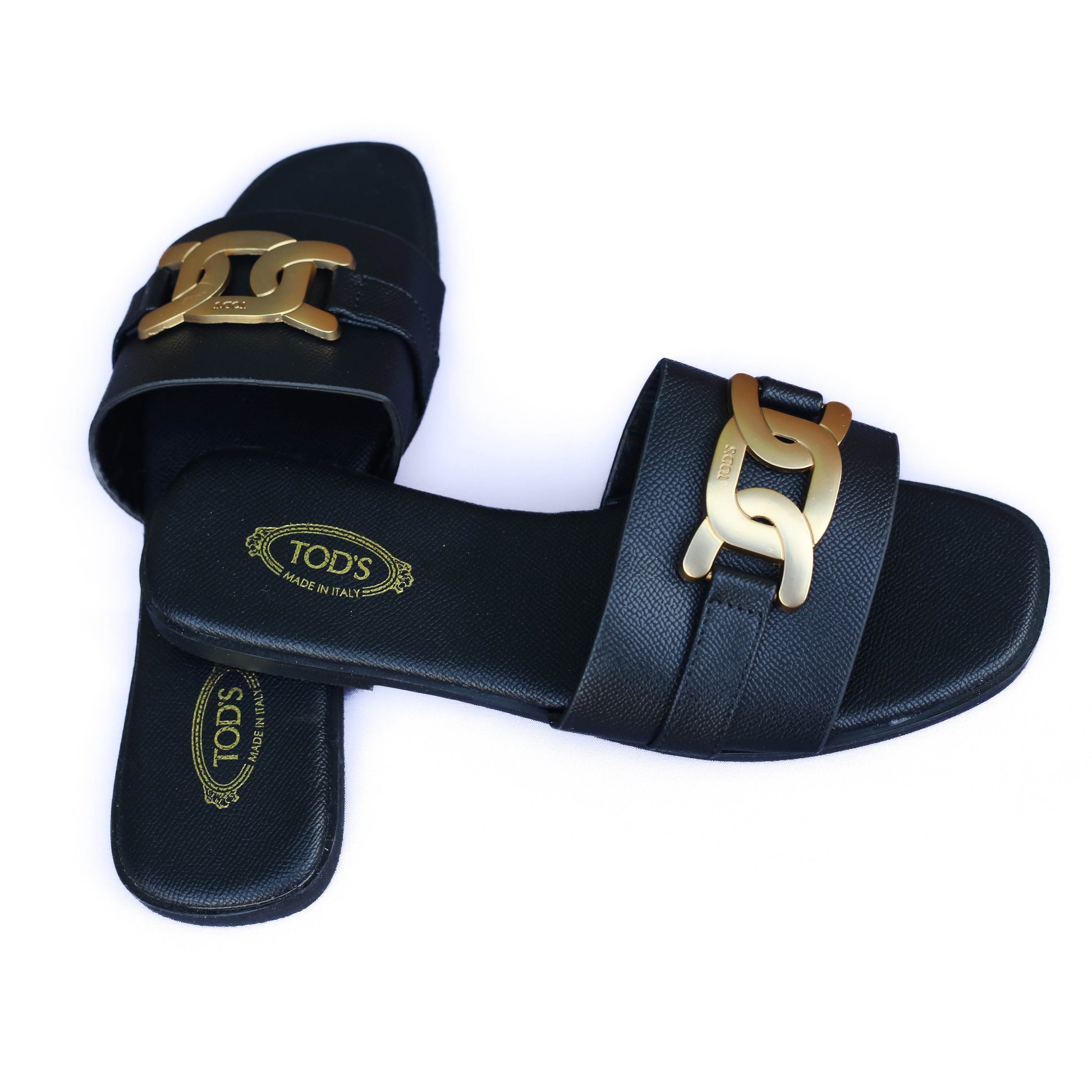 Ces mules plates sont l'accessoire parfait pour un look à la fois chic et confortable. Leur design épuré est rehaussé d'une sangle large ornée d'un maillon doré distinctif, ajoutant une touche de luxe et de modernité à toutes vos tenues. La semelle plate et légère vous garantit un confort optimal et une grande facilité à porter, du matin au soir.