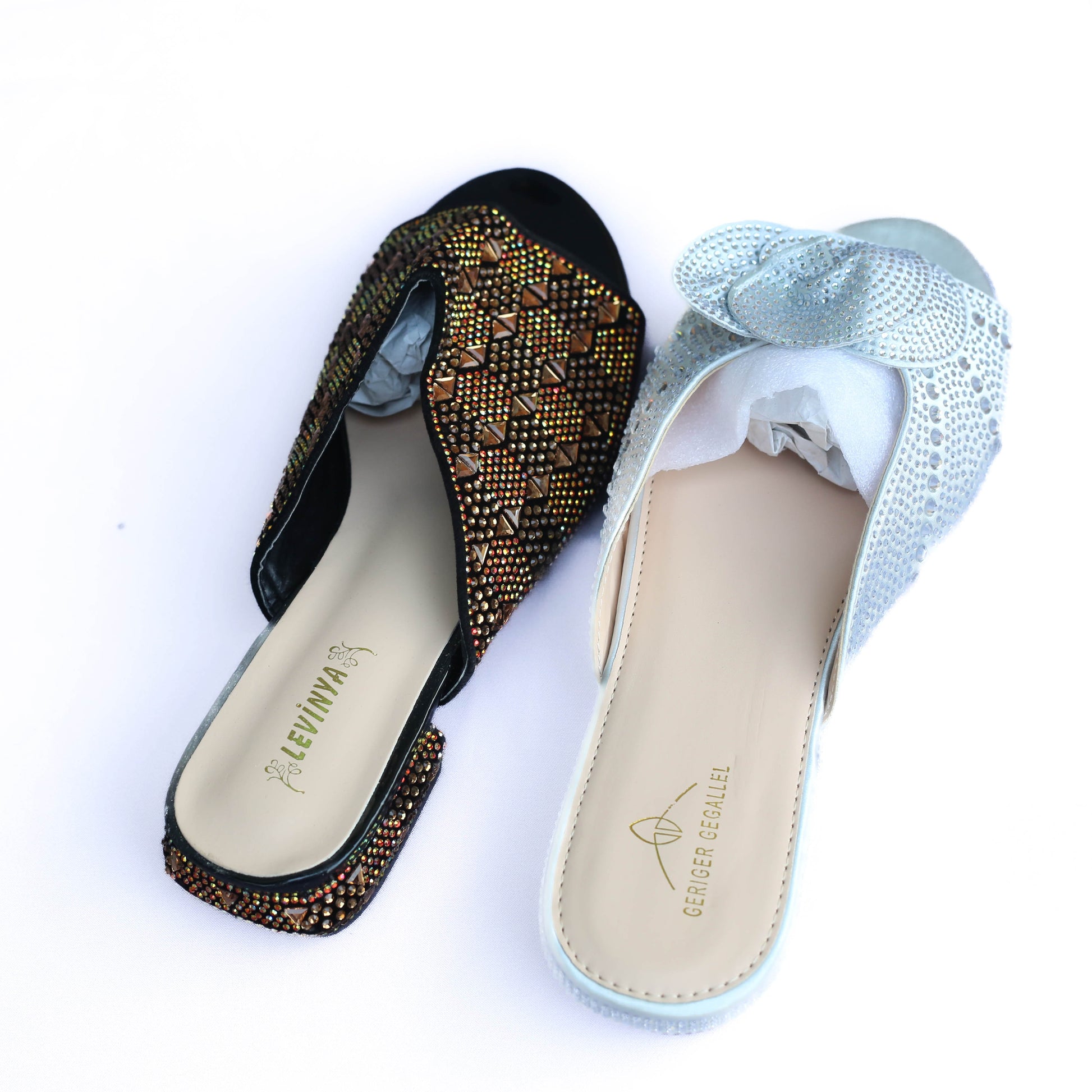 Ces mules plates sont la pièce maîtresse d'un look audacieux et glamour. Elles se déclinent en deux styles distincts : l'une est ornée de strass aux motifs géométriques, tandis que l'autre est rehaussée d'un grand nœud en paillettes et strass. La semelle plate et confortable vous garantit un bien-être optimal sans compromettre votre style.